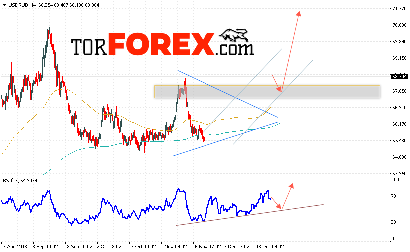 Таким образом, USD/RUB прогноз курса Доллара на 26 декабря 2018 предполагает попытку теста уровня поддержки вблизи области 67.65. Откуда стоит ожидать отскок и продолжения роста курса Доллара против Рубля с целью выше уровня 71.35. Дополнительным сигналом в пользу роста пары выступит тест линии тренда на индикаторе относительной силы. Отменой варианта подъёма станет пробой области поддержки и закрытие котировок ниже уровня 65.90.