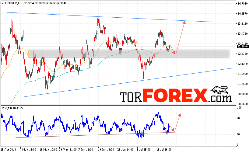 Таким образом, USD/RUB прогноз курса Доллара на 26 июля 2018 предполагает попытку теста уровня поддержки вблизи области 62.55, откуда стоит ожидать отскок и попытку продолжения роста курса Доллара против Рубля с целью выше уровня 63.90, дополнительным сигналом в пользу роста пары выступит тест линии тренда на индикаторе относительной силы, отменой варианта роста станет пробой области поддержки и закрытие котировок ниже уровня 61.40.