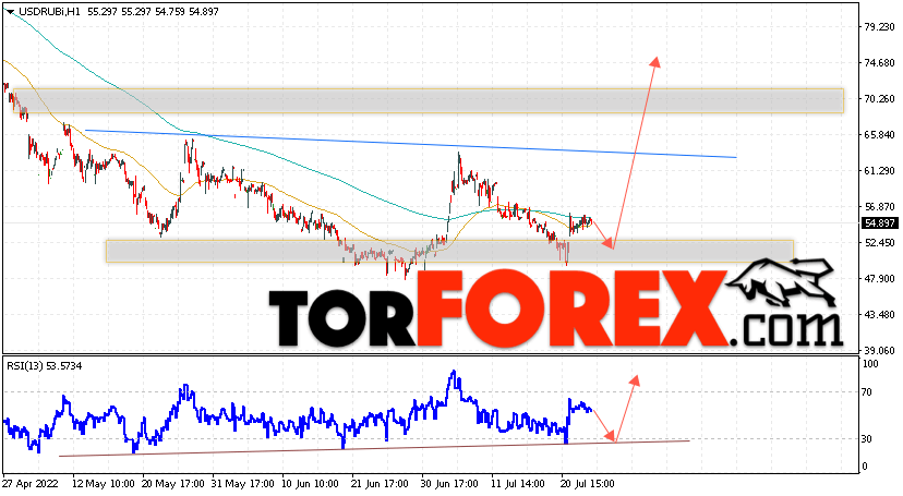 Дополнительным сигналом в пользу роста валютной пары USD/RUB 26 июля 2022 выступит тест линии тренда на индикаторе относительной силы. Вторым сигналом станет отскок от нижней границы разворотной модели перевёрнутая ”Голова и плечи”. Отменой варианта роста пары USD/RUB на Форекс станет падение котировок и пробой уровня 45.35 Рублей за Доллар. Это укажет на пробой области поддержки и продолжение падения пары Доллар Рубль в область ниже уровня 40.05. Подтверждением росту пары выступит пробой области сопротивления и закрытие котировок актива над уровнем 66.05, что укажет на пробой линии ”Шеи” разворотной модели ”Голова и плечи” и начало отработки паттерна с целями вверху.