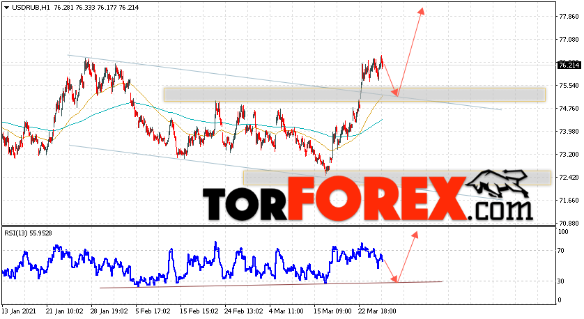 Дополнительным сигналом в пользу роста валютной пары USD/RUB 26 марта 2021 выступит тест линии поддержки на индикаторе относительной силы. Вторым сигналом станет отскок от верхней границы нисходящего канала. Отменой варианта роста пары USD/RUB на Форекс станет падение и пробой уровня 73.95. Рублей за Доллар. Это укажет на пробой области поддержки и продолжение падения пары Доллар Рубль в область ниже уровня 68.35. Подтверждением подъёма пары выступит пробой области сопротивления и закрытие котировок актива над уровнем 77.55.