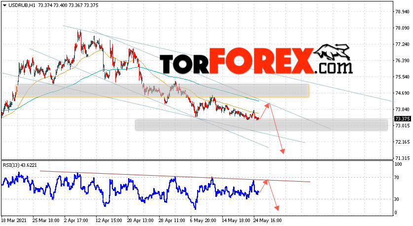Дополнительным сигналом в пользу падения валютной пары USD/RUB 26 мая 2021 выступит тест линии сопротивления на индикаторе относительной силы. Вторым сигналом станет отскок от верхней границы медвежьего канала. Отменой варианта падения пары USD/RUB на Форекс станет сильный рост и пробой уровня 75.55. Рублей за Доллар. Это укажет на пробой области сопротивления и продолжение роста пары Доллар Рубль в область выше уровня 77.85. Подтверждением падения пары выступит пробой области поддержки и закрытие котировок актива под уровнем 72.65.
