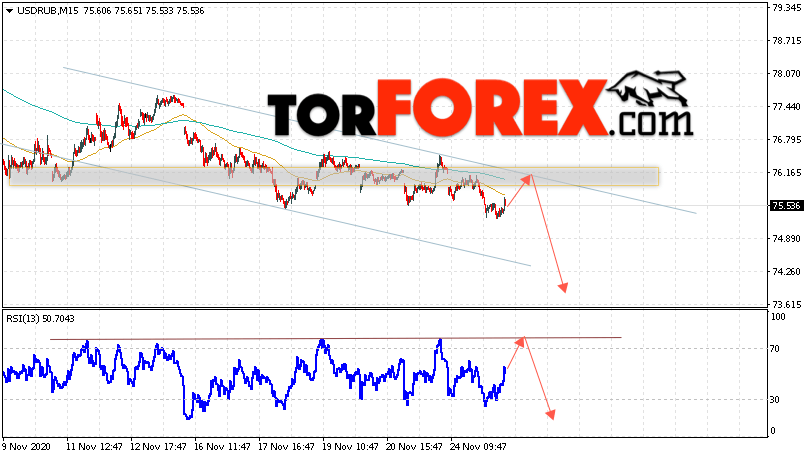 Дополнительным сигналом в пользу падения валютной пары USD/RUB 26 ноября 2020 выступит тест линии сопротивления на индикаторе относительной силы. Вторым сигналом станет отскок от верхней границы нисходящего канала. Отменой варианта падения пары USD/RUB на Форекс станет сильный рост и пробой уровня 77.75. Рублей за Доллар. Это укажет на пробой области сопротивления и продолжение роста пары Доллар Рубль в область выше уровня 81.25. Подтверждением падения пары выступит пробой области поддержки и закрытие котировок актива под уровнем 74.65.