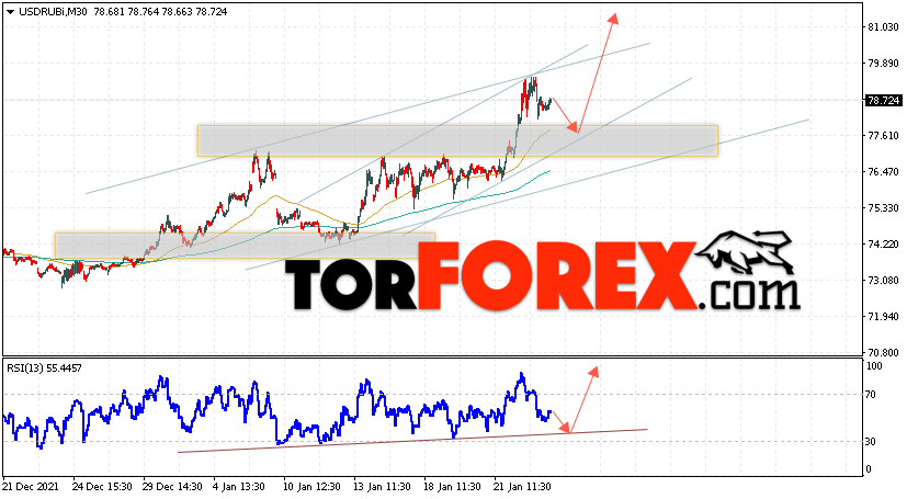Дополнительным сигналом в пользу роста валютной пары USD/RUB 26 января 2022 выступит тест линии тренда на индикаторе относительной силы. Вторым сигналом станет отскок от нижней границы бычьего канала. Отменой варианта роста пары USD/RUB на Форекс станет падение котировок и пробой уровня 75.45 Рублей за Доллар. Это укажет на пробой области поддержки и продолжение падения пары Доллар Рубль в область ниже уровня 73.25. Подтверждением подъёма пары выступит пробой области сопротивления и закрытие котировок актива над уровнем 79.95, что укажет на пробой верхней границы бычьего канала.