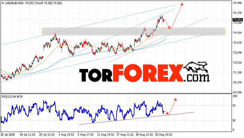 Дополнительным сигналом в пользу подъёма валютной пары USD/RUB 27 августа 2020 выступит тест линии поддержки на индикаторе относительной силы. Вторым сигналом станет отскок от верхней границы модели «Треугольник». Отменой варианта роста пары USD/RUB на Форекс станет падение и пробой уровня 73.95. Рублей за Доллар. Это укажет на пробой области поддержки и продолжение падения пары Доллар Рубль в область ниже уровня 70.35. Подтверждением роста пары выступит пробой области сопротивления и закрытие котировок актива над уровнем 75.65.