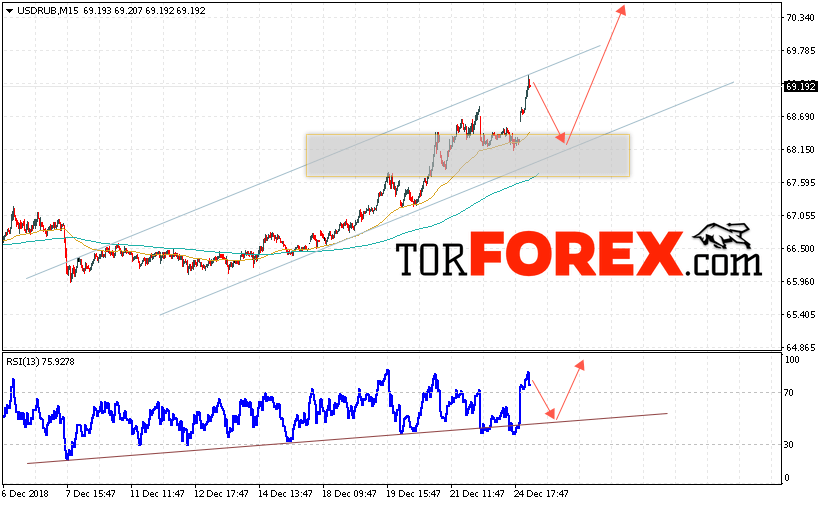Таким образом, USD/RUB прогноз курса Доллара на 27 декабря 2018 предполагает попытку теста уровня поддержки вблизи области 68.25. Откуда стоит ожидать отскок и продолжения роста курса Доллара против Рубля с целью выше уровня 70.65. Дополнительным сигналом в пользу роста пары выступит тест линии тренда на индикаторе относительной силы. Отменой варианта подъёма станет пробой области поддержки и закрытие котировок ниже уровня 67.50.