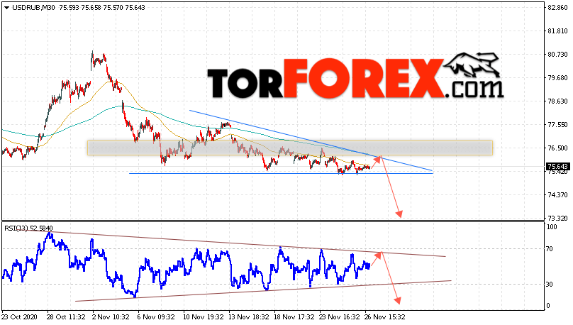 Дополнительным сигналом в пользу падения валютной пары USD/RUB 26 ноября 2020 выступит тест линии сопротивления на индикаторе относительной силы. Вторым сигналом станет отскок от верхней границы модели ”Треугольник”. Отменой варианта падения пары USD/RUB на Форекс станет сильный рост и пробой уровня 77.45. Рублей за Доллар. Это укажет на пробой области сопротивления и продолжение роста пары Доллар Рубль в область выше уровня 81.45. Подтверждением падения пары выступит пробой области поддержки и закрытие котировок актива под уровнем 74.75.