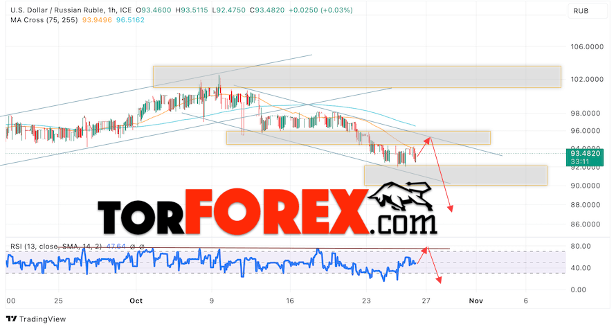 Дополнительным сигналом в пользу падения валютной пары USD/RUB 27 октября 2023 выступит тест линии тренда на индикаторе относительной силы. Вторым сигналом станет отскок от верхней границы медвежьего канала. Отменой варианта падения пары USD/RUB на Форекс станет сильный рост котировок и пробой уровня 98.25 Рублей за Доллар. Это укажет на пробой области сопротивления и продолжение роста пары Доллар Рубль в область выше уровня 102.65. Подтверждением падению пары выступит пробой области поддержки и закрытие котировок актива под уровнем 90.05.