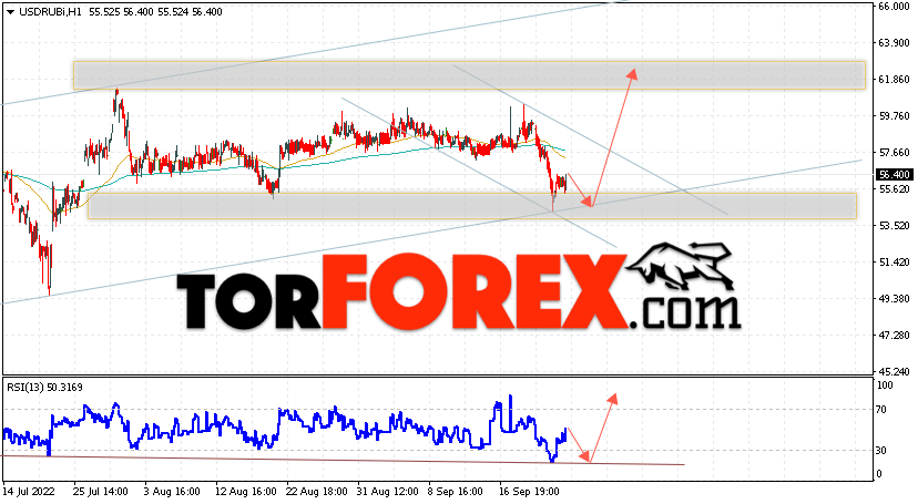 Дополнительным сигналом в пользу роста валютной пары USD/RUB 27 сентября 2022 выступит тест линии тренда на индикаторе относительной силы. Вторым сигналом станет отскок от нижней границы бычьего канала. Отменой варианта роста пары USD/RUB на Форекс станет падение котировок и пробой уровня 52.35 Рублей за Доллар. Это укажет на пробой области поддержки и продолжение падения пары Доллар Рубль в область ниже уровня 47.65. Подтверждением росту пары выступит пробой области сопротивления и закрытие котировок актива над уровнем 59.25, что укажет на пробой верхней границы нисходящего канала.
