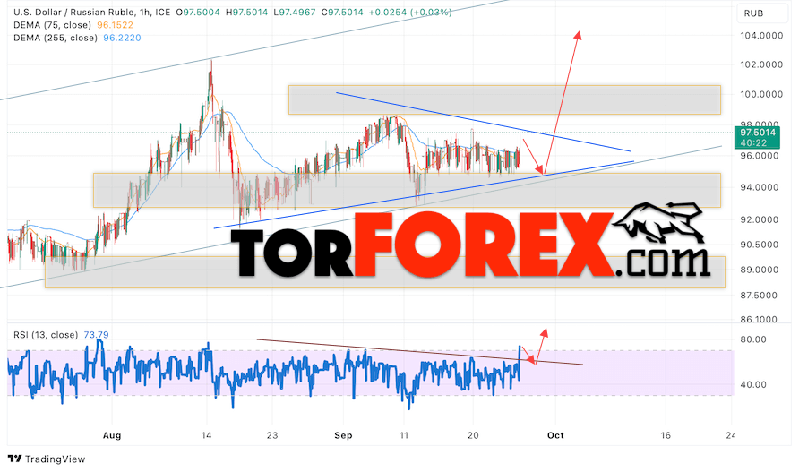 Валютная пара Доллар Рубль USD/RUB продолжает движение в рамках роста и формирования модели «Треугольник». В момент публикации прогноза курс Доллара США к Российскому Рублю составляет 97.50. Скользящие средние указывают на наличие краткосрочной медвежьей тенденции. Цены вновь тестируют область между сигнальными линиями, что указывает на давление со стороны продавцов американской валюты и потенциальное продолжение падения Доллара США против Российского Рубля. В рамках прогноза курса Доллара на 27 сентября 2023 стоит ожидать попытку развития коррекции цены и тест уровня поддержки вблизи области 94.35 Рублей за Доллар США. Затем, отскок вверх и продолжение роста валютной пары в область выше уровня 104.45.