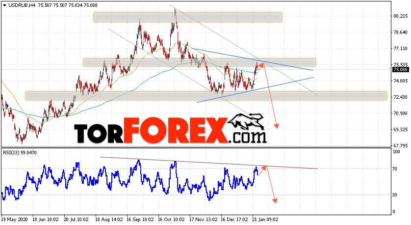 Дополнительным сигналом в пользу снижения валютной пары USD/RUB 27 января 2021 выступит тест линии сопротивления на индикаторе относительной силы. Вторым сигналом станет отскок от верхней границы модели ”Треугольник”. Отменой варианта падения пары USD/RUB на Форекс станет сильный рост и пробой уровня 77.05. Рублей за Доллар. Это укажет на пробой области сопротивления и продолжение подъёма пары Доллар Рубль в область выше уровня 78.95. Подтверждением снижения пары выступит пробой области поддержки и закрытие котировок актива под уровнем 72.35.