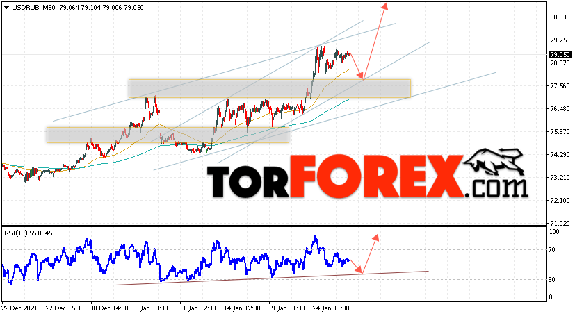 Дополнительным сигналом в пользу роста валютной пары USD/RUB 27 января 2022 выступит тест линии тренда на индикаторе относительной силы. Вторым сигналом станет отскок от нижней границы бычьего канала. Отменой варианта роста пары USD/RUB на Форекс станет падение котировок и пробой уровня 75.65 Рублей за Доллар. Это укажет на пробой области поддержки и продолжение падения пары Доллар Рубль в область ниже уровня 73.15. Подтверждением подъёма пары выступит пробой области сопротивления и закрытие котировок актива над уровнем 80.05, что укажет на пробой верхней границы бычьего канала.