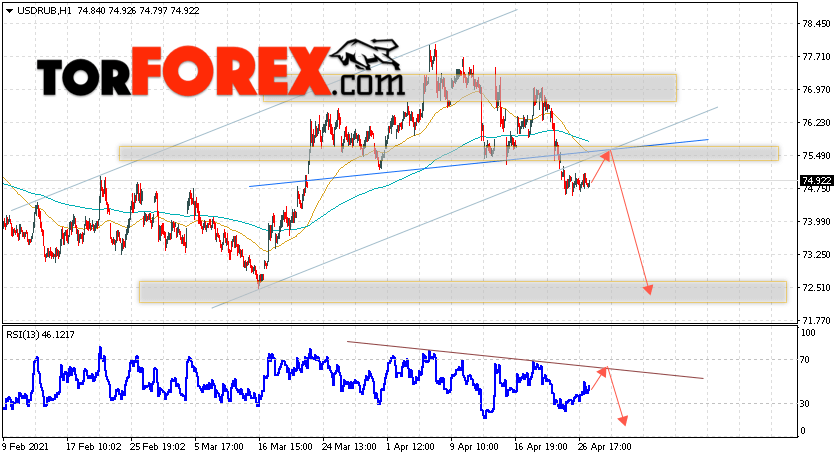 Дополнительным сигналом в пользу падения валютной пары USD/RUB 28 апреля 2021 выступит тест линии сопротивления на индикаторе относительной силы. Вторым сигналом станет отскок от линии ”Шеи” разворотной модели ”Голова и плечи”. Отменой варианта падения пары USD/RUB на Форекс станет сильный рост и пробой уровня 78.05. Рублей за Доллар. Это укажет на пробой области сопротивления и продолжение роста пары Доллар Рубль в область выше уровня 82.55. Подтверждением падения пары выступит пробой области поддержки и закрытие котировок актива под уровнем 74.05.