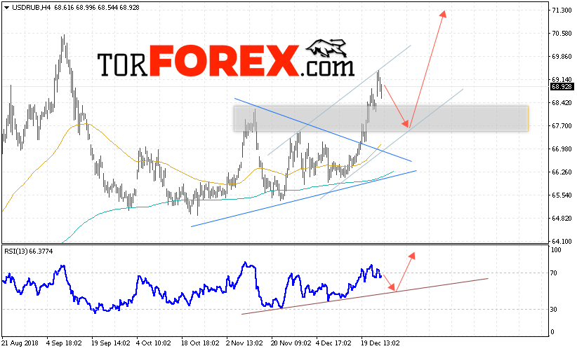 Таким образом, USD/RUB прогноз курса Доллара на 28 декабря 2018 предполагает попытку теста уровня поддержки вблизи области 67.75. Откуда стоит ожидать отскок и продолжения роста курса Доллара против Рубля с целью выше уровня 71.35. Дополнительным сигналом в пользу роста пары выступит тест линии тренда на индикаторе относительной силы. Отменой варианта подъёма станет пробой области поддержки и закрытие котировок ниже уровня 67.40.