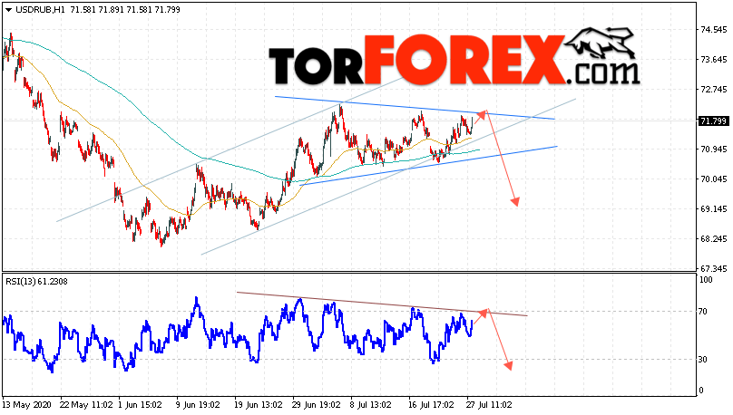 Дополнительным сигналом в пользу падения валютной пары USD/RUB 28 июля 2020 выступит тест линии сопротивления на индикаторе относительной силы. Вторым сигналом станет пробой нижней границы модели «Треугольник». Отменой варианта падения пары USD/RUB на Форекс станет сильный рост и пробой уровня 73.05. Рублей за Доллар. Это укажет на пробой области сопротивления и продолжение роста пары Доллар Рубль в область выше уровня 75.55. Подтверждением падения пары выступит пробой области поддержки и закрытие под уровнем 69.95, что укажет на завершение формирования модели «Треугольник».