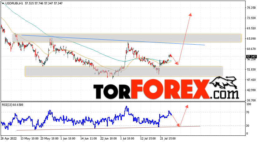 Таким образом, USD/RUB прогноз курса Доллара на 28 июля 2022 предполагает попытку теста уровня поддержки вблизи области 55.85. Откуда стоит ожидать отскок и продолжения роста курса Доллара против Рубля с целью выше уровня 74.05. Дополнительным сигналом в пользу роста пары выступит тест линии тренда на индикаторе относительной силы. Отменой варианта подъёма станет пробой области поддержки и закрытие котировок ниже уровня 46.05. В таком случае стоит ожидать продолжения падения курса доллара США против российской валюты к уровню 40.05.