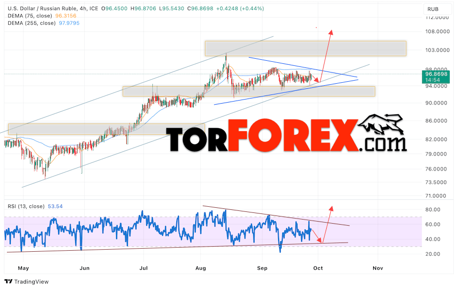 Валютная пара Доллар Рубль USD/RUB продолжает движение в рамках роста и формирования модели «Треугольник». В момент публикации прогноза курс Доллара США к Российскому Рублю составляет 96.86. Скользящие средние указывают на наличие краткосрочной медвежьей тенденции. Цены вновь тестируют область между сигнальными линиями, что указывает на давление со стороны продавцов американской валюты и потенциальное продолжение падения Доллара США против Российского Рубля. В рамках прогноза курса Доллара на 28 сентября 2023 стоит ожидать попытку развития коррекции цены и тест уровня поддержки вблизи области 97.25 Рублей за Доллар США. Затем, отскок вверх и продолжение роста валютной пары в область выше уровня 108.65.