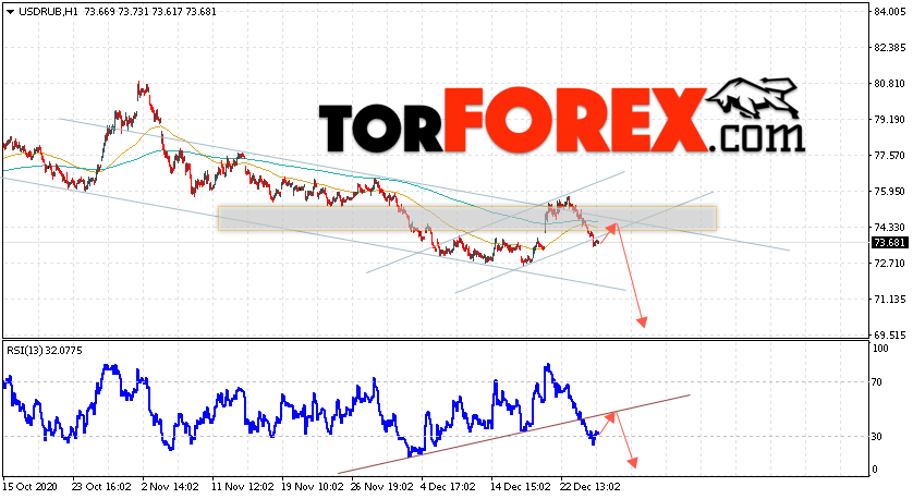 Дополнительным сигналом в пользу снижения валютной пары USD/RUB 29 декабря 2020 выступит тест линии сопротивления на индикаторе относительной силы. Вторым сигналом станет отскок от верхней границы нисходящего канала. Отменой варианта падения пары USD/RUB на Форекс станет сильный рост и пробой уровня 76.45. Рублей за Доллар. Это укажет на пробой области сопротивления и продолжение подъёма пары Доллар Рубль в область выше уровня 79.65. Подтверждением падения пары выступит пробой области поддержки и закрытие котировок актива под уровнем 71.35.