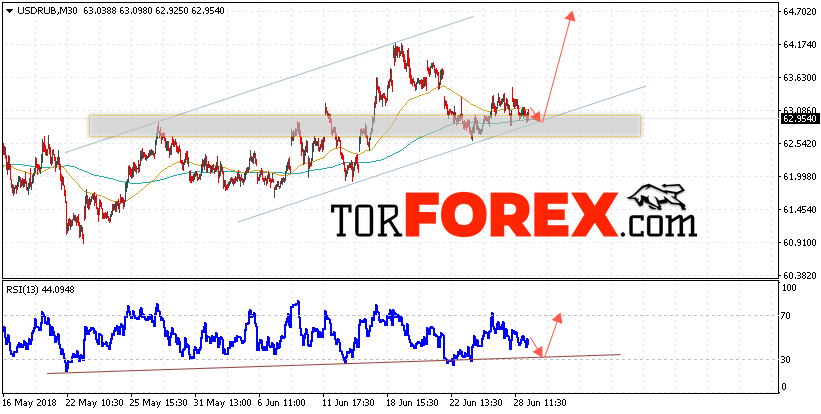 Таким образом, USD/RUB прогноз курса Доллара на 29 июня 2018 предполагает попытку теста уровня поддержки вблизи области 62.85, откуда стоит ожидать отскок и попытку продолжения роста курса Доллара против Рубля с целью выше уровня 64.70, дополнительным сигналом в пользу роста пары выступит тест восходящей линии тренда на индикаторе относительной силы.