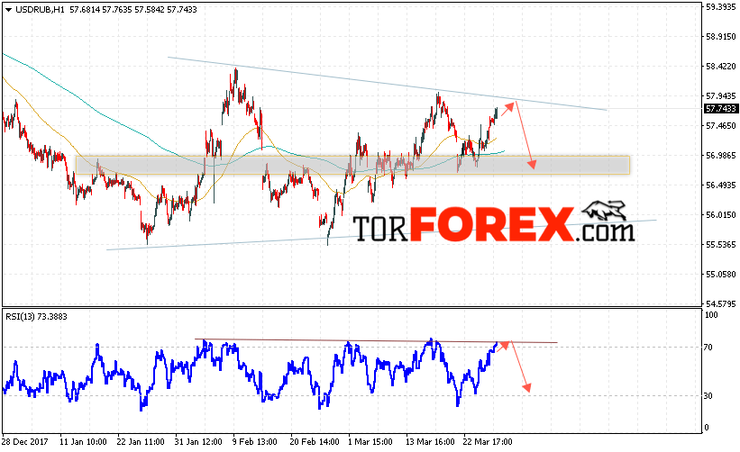 Таким образом, USD/RUB прогноз курса Доллара на 29 марта 2018 предполагает попытку теста уровня сопротивления вблизи области 57.85, откуда стоит ожидать отскок и попытку продолжения падения курса Доллара против Рубля с целью ниже уровня 56.70, дополнительным сигналом в пользу падения пары выступит тест линии тренда на индикаторе относительной силы.