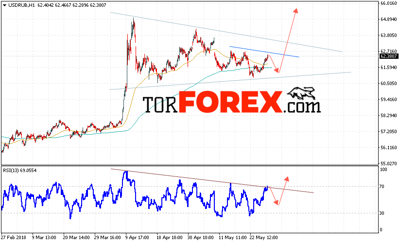 Таким образом, USD/RUB прогноз курса Доллара на 29 мая 2018 предполагает попытку теста уровня поддержки вблизи области 61.55, откуда стоит ожидать отскок и попытку продолжения роста курса Доллара против Рубля с целью выше уровня 65.50, дополнительным сигналом в пользу роста пары выступит пробой линии тренда на индикаторе относительной силы.