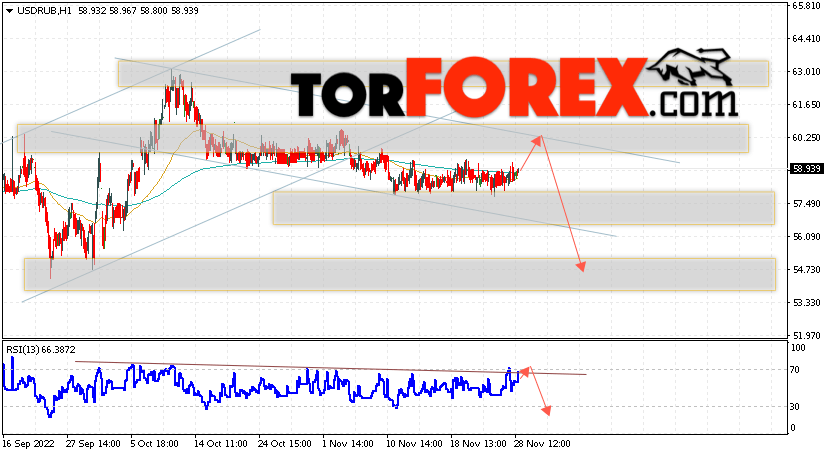 Дополнительным сигналом в пользу падения валютной пары USD/RUB 29 ноября 2022 выступит тест нисходящей линии тренда на индикаторе относительной силы. Вторым сигналом станет отскок от верхней границы нисходящего канала. Отменой варианта падения пары USD/RUB на Форекс станет сильный рост котировок и пробой уровня 61.65 Рублей за Доллар. Это укажет на пробой области сопротивления и продолжение роста пары Доллар Рубль в область выше уровня 63.65. Подтверждением падению пары выступит пробой области поддержки и закрытие котировок актива под уровнем 55.65, что укажет на пробой нижней границы нисходящего канал.