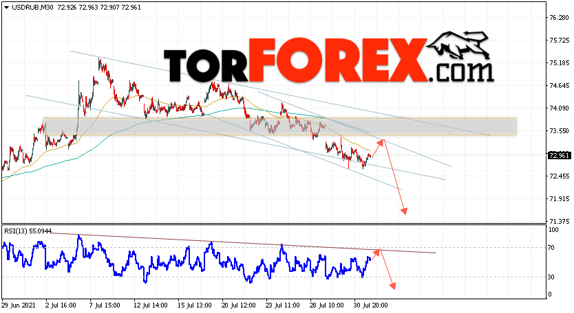 Дополнительным сигналом в пользу снижения валютной пары USD/RUB 30 июля 2021 выступит тест линии тренда на индикаторе относительной силы. Вторым сигналом станет отскок от верхней границы нисходящего канала. Отменой варианта падения пары USD/RUB на Форекс станет сильный рост и пробой уровня 74.25. Рублей за Доллар. Это укажет на пробой области сопротивления и продолжение подъёма пары Доллар Рубль в область выше уровня 75.85. Подтверждением падения пары выступит пробой области поддержки и закрытие котировок актива под уровнем 72.05.