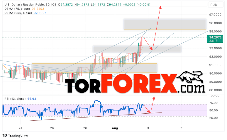Валютная пара Доллар Рубль USD/RUB продолжает движение в рамках роста и бычьего канала. В момент публикации прогноза курс Доллара США к Российскому Рублю составляет 94.28. Скользящие средние указывают на наличие краткосрочной медвежьей тенденции. Цены пробили область между сигнальными линиями вверх, что указывает на давление со стороны продавцов американской валюты и потенциальное продолжение падения Доллара США против Российского Рубля. В рамках прогноза курса Доллара на 3 августа 2023 стоит ожидать попытку развития коррекции цены и тест уровня поддержки вблизи области 92.55 Рублей за Доллар США. Затем, отскок вверх и продолжение роста валютной пары в область выше уровня 98.65.