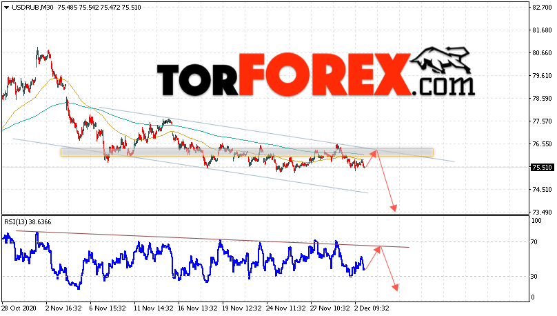 Дополнительным сигналом в пользу подъёма валютной пары USD/RUB 3 декабря 2020 выступит тест линии сопротивления на индикаторе относительной силы. Вторым сигналом станет отскок от верхней границы нисходящего канала. Отменой варианта роста пары USD/RUB на Форекс станет сильный рост и пробой уровня 76.95. Рублей за Доллар. Это укажет на пробой области сопротивления и продолжение подъёма пары Доллар Рубль в область выше уровня 79.95. Подтверждением падения пары выступит пробой области поддержки и закрытие котировок актива под уровнем 75.45.