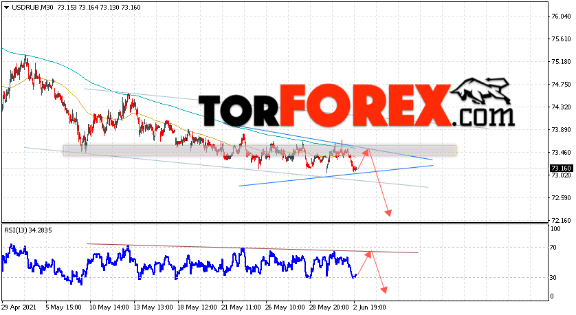 Дополнительным сигналом в пользу падения валютной пары USD/RUB 3 июня 2021 выступит тест линии сопротивления на индикаторе относительной силы. Вторым сигналом станет отскок от верхней границы модели ”Треугольник”. Отменой варианта падения пары USD/RUB на Форекс станет сильный рост и пробой уровня 74.05. Рублей за Доллар. Это укажет на пробой области сопротивления и продолжение роста пары Доллар Рубль в область выше уровня 76.75. Подтверждением падения пары выступит пробой области поддержки и закрытие котировок актива под уровнем 72.55, что укажет на начало отработки модели ”Треугольник”.