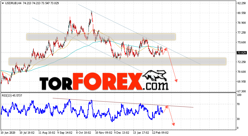 Дополнительным сигналом в пользу падения валютной пары USD/RUB 3 марта 2021 выступит тест линии сопротивления на индикаторе относительной силы. Вторым сигналом станет отскок от верхней границы нисходящего канала. Отменой варианта падения пары USD/RUB на Форекс станет сильный рост и пробой уровня 75.85. Рублей за Доллар. Это укажет на пробой области сопротивления и продолжение роста пары Доллар Рубль в область выше уровня 78.05. Подтверждением падения пары выступит пробой области поддержки и закрытие котировок актива под уровнем 72.95.