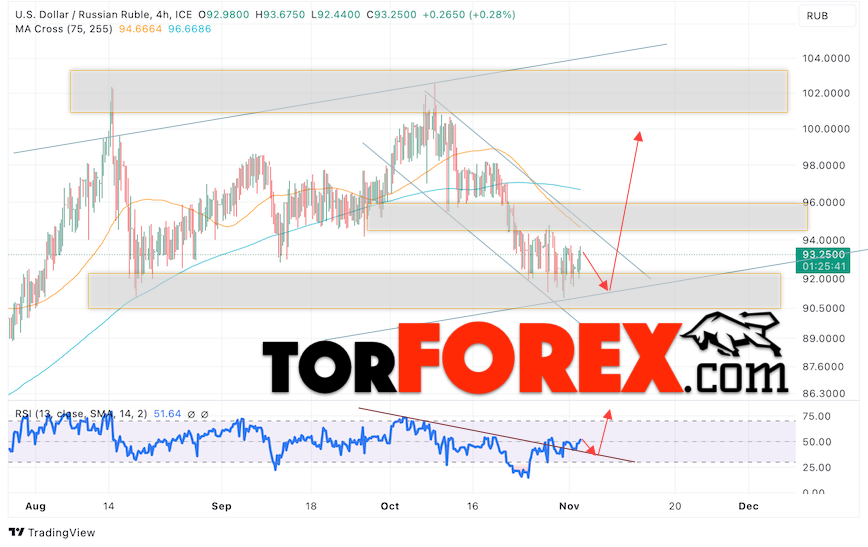 Дополнительным сигналом в пользу падения валютной пары USD/RUB 3 ноября 2023 выступит тест линии тренда на индикаторе относительной силы. Вторым сигналом станет отскок от нижней границы бычьего канала. Отменой варианта роста пары USD/RUB на Форекс станет падение котировок и пробой уровня 88.65 Рублей за Доллар. Это укажет на пробой области поддержки и продолжение падения пары Доллар Рубль в область ниже уровня 83.25. Подтверждением росту пары выступит пробой области сопротивления и закрытие котировок актива над уровнем 95.05, что укажет на пробой верхней границы нисходящего канала коррекции.