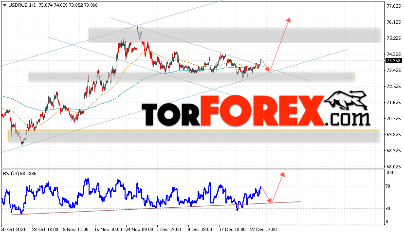 Дополнительным сигналом в пользу роста валютной пары USD/RUB 30 декабря 2021 выступит тест нисходящей линии тренда на индикаторе относительной силы. Вторым сигналом станет отскок от верхней границы нисходящего канала, который был пробит вверх. Отменой варианта подъёма пары USD/RUB на Форекс станет падение и пробой уровня 72.35 Рублей за Доллар. Это укажет на пробой области поддержки и продолжение падения пары Доллар Рубль в область ниже уровня 70.15. Подтверждением подъёма пары выступит пробой области сопротивления и закрытие котировок актива над уровнем 74.55.