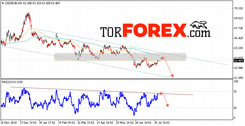 В пользу снижения пары USD/RUB 30 июля 2019 выступит тест линии сопротивления на индикаторе относительной силы. Вторым сигналом станет отскок от уровня верхней границы нисходящего канала. Отменой варианта падения пары USD/RUB на Форекс станет сильный рост и пробой уровня 64.95 Рублей за Доллар. Это укажет на пробой области сопротивления и продолжение роста пары Доллар Рубль в область выше уровня 67.65. Подтверждением падения пары выступит пробой области поддержки и закрытие под уровнем 62.20.