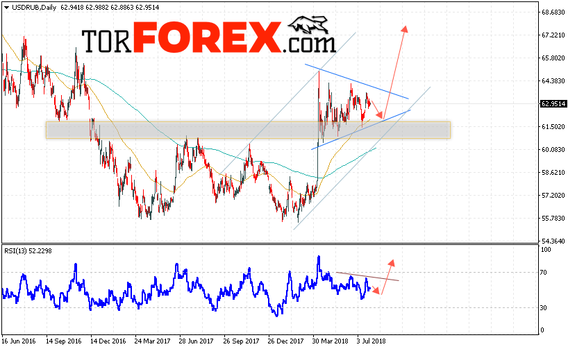 Таким образом, USD/RUB прогноз курса Доллара на 30 июля — 3 августа 2018 предполагает попытку теста области поддержки вблизи уровня 62.20, откуда стоит ожидать попытку роста Доллара в область выше уровня 67.20, в пользу роста пары выступит тест линии тренда на индикаторе относительной силы, отменой варианта роста курса Доллара на текущей торговой неделе станет падение и пробой области 61.20, что укажет на продолжение снижения пары.