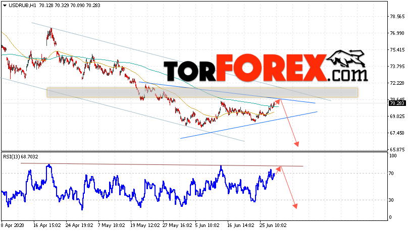 Дополнительным сигналом в пользу падения валютной пары USD/RUB 30 июня 2020 выступит тест линии сопротивления на индикаторе относительной силы. Вторым сигналом станет отскок от верхней границы модели «Треугольник». Отменой варианта падения пары USD/RUB на Форекс станет сильный рост и пробой уровня 72.35. Рублей за Доллар. Это укажет на пробой области сопротивления и продолжение подъёма пары Доллар Рубль в область выше уровня 73.95. Подтверждением падения пары выступит пробой области поддержки и закрытие под уровнем 67.95.