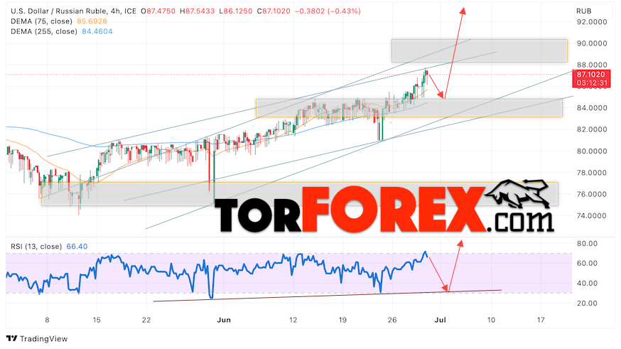 Дополнительным сигналом в пользу подъёма валютной пары USD/RUB 30 июня 2023 выступит тест линии тренда на индикаторе относительной силы. Вторым сигналом станет отскок от нижней границы бычьего канала. Отменой варианта роста пары USD/RUB на Форекс станет падение котировок и пробой уровня 82.05 Рублей за Доллар. Это укажет на пробой области поддержки и продолжение падения пары Доллар Рубль в область ниже уровня 75.85. Подтверждением росту пары выступит пробой области сопротивления и закрытие котировок актива над уровнем 89.55, что укажет на пробой верхней границы бычьего канала, а это сигнал к росту на ширину канала.
