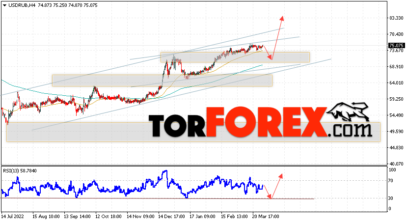 Дополнительным сигналом в пользу подъёма валютной пары USD/RUB 30 марта 2023 выступит тест бычьей линии тренда на индикаторе относительной силы. Вторым сигналом станет отскок от нижней границы бычьего канала. Отменой варианта роста пары USD/RUB на Форекс станет падение котировок и пробой уровня 67.55 Рублей за Доллар. Это укажет на пробой области поддержки и продолжение падения пары Доллар Рубль в область ниже уровня 63.65. Подтверждением росту пары выступит пробой области сопротивления и закрытие котировок актива над уровнем 80.05, что укажет на пробой верхней границы бычьего канала, а это сигнал к росту на ширину канала.