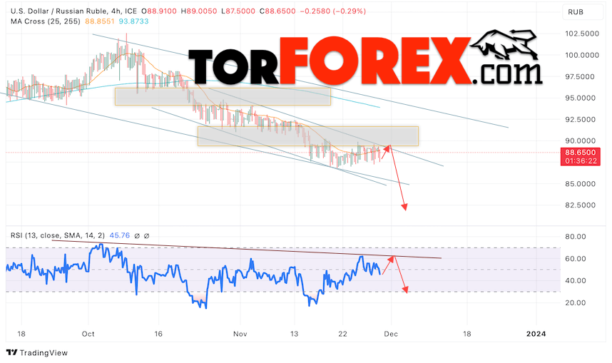 Дополнительным сигналом в пользу падения валютной пары USD/RUB 30 ноября 2023 выступит тест линии тренда на индикаторе относительной силы. Вторым сигналом станет отскок от верхней границы медвежьего канала. Отменой варианта снижения пары USD/RUB на Форекс станет сильный рост котировок и пробой уровня 92.85 Рублей за Доллар. Это укажет на пробой области сопротивления и продолжение роста пары Доллар Рубль в область выше уровня 94.85. Подтверждением падению пары выступит пробой области поддержки и закрытие котировок актива под уровнем 87.05.