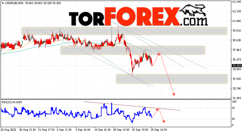 Дополнительным сигналом в пользу падения валютной пары USD/RUB 30 сентября 2022 выступит тест линии тренда на индикаторе относительной силы. Вторым сигналом станет отскок от верхней границы нисходящего канала. Отменой варианта падения пары USD/RUB на Форекс станет сильный рост котировок и пробой уровня 59.05 Рублей за Доллар. Это укажет на пробой области сопротивления и продолжение роста пары Доллар Рубль в область ниже уровня 62.75. Подтверждением падению пары выступит пробой области поддержки и закрытие котировок актива под уровнем 52.95.
