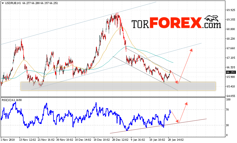 Таким образом, USD/RUB прогноз курса Доллара на 30 января 2019 предполагает попытку теста уровня поддержки вблизи области 65.65. Откуда стоит ожидать отскок и продолжения роста курса Доллара против Рубля с целью выше уровня 67.65. Дополнительным сигналом в пользу роста пары выступит тест области поддержки на индикаторе относительной силы. Отменой варианта роста станет пробой области поддержки и закрытие котировок ниже уровня 64.95.