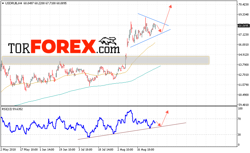 В пользу роста пары USD/RUB выступит тест восходящей линии тренда на индикаторе относительной силы. Отменой варианта роста пары USD/RUB на Форекс станет падение и пробой уровня 66.80 Рублей за Доллар, что укажет на пробой нижней границы модели «Треугольник» и продолжение падения пары Доллар Рубль в область ниже уровня 63.580. Подтверждением роста пары выступит пробой верхней границы модели «Треугольник» и закрытие выше уровня 68.60.