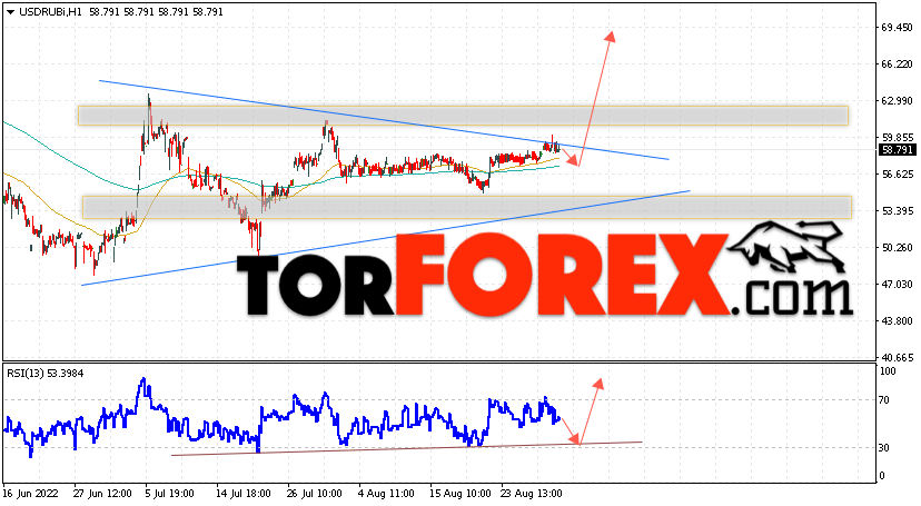 Дополнительным сигналом в пользу роста валютной пары USD/RUB 31 августа 2022 выступит тест линии тренда на индикаторе относительной силы. Вторым сигналом станет отскок от нижней границы модели ”Треугольник”. Отменой варианта роста пары USD/RUB на Форекс станет падение котировок и пробой уровня 53.35 Рублей за Доллар. Это укажет на пробой области поддержки и продолжение падения пары Доллар Рубль в область ниже уровня 48.35. Подтверждением росту пары выступит пробой области сопротивления и закрытие котировок актива над уровнем 61.55, что укажет на пробой верхней границы модели ”Треугольник” и начал отработки модели с целями вверху.
