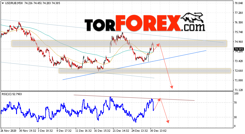 Дополнительным сигналом в пользу снижения валютной пары USD/RUB 31 декабря 2020 выступит тест линии сопротивления на индикаторе относительной силы. Вторым сигналом станет отскок от верхней границы модели ”Голова и плечи”. Отменой варианта падения пары USD/RUB на Форекс станет сильный рост и пробой уровня 76.05. Рублей за Доллар. Это укажет на пробой области сопротивления и продолжение подъёма пары Доллар Рубль в область выше уровня 79.55. Подтверждением падения пары выступит пробой области поддержки и закрытие котировок актива под уровнем 73.05, что укажет на завершение формирования разворотной модели.