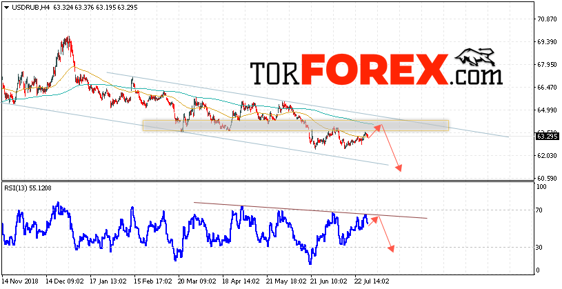 В пользу снижения пары USD/RUB 31 июля 2019 выступит тест линии сопротивления на индикаторе относительной силы. Вторым сигналом станет отскок от уровня верхней границы нисходящего канала. Отменой варианта падения пары USD/RUB на Форекс станет сильный рост и пробой уровня 64.95 Рублей за Доллар. Это укажет на пробой области сопротивления и продолжение роста пары Доллар Рубль в область выше уровня 67.55. Подтверждением падения пары выступит пробой области поддержки и закрытие под уровнем 62.35.