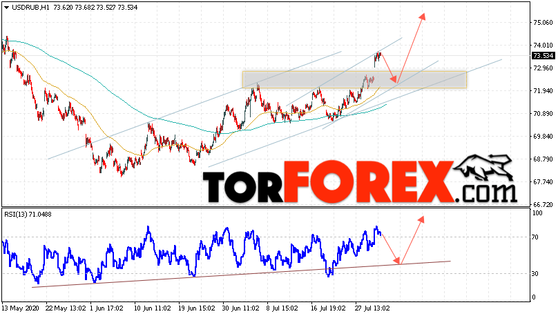 Дополнительным сигналом в пользу подъёма валютной пары USD/RUB 31 июля 2020 выступит тест линии поддержки на индикаторе относительной силы. Вторым сигналом станет отскок от нижней границы восходящего канала. Отменой варианта роста пары USD/RUB на Форекс станет падение и пробой уровня 70.85. Рублей за Доллар. Это укажет на пробой области поддержки и продолжение падения пары Доллар Рубль в область ниже уровня 68.45. Подтверждением роста пары выступит пробой области сопротивления и закрытие котировок актива над уровнем 74.15.