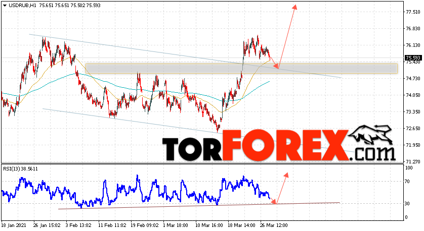 Дополнительным сигналом в пользу роста валютной пары USD/RUB 31 марта 2021 выступит тест линии поддержки на индикаторе относительной силы. Вторым сигналом станет отскок от верхней границы нисходящего канала, который быки уверенно пробили вверх. Отменой варианта роста пары USD/RUB на Форекс станет падение и пробой уровня 73.95. Рублей за Доллар. Это укажет на пробой области поддержки и продолжение падения пары Доллар Рубль в область ниже уровня 68.45. Подтверждением подъёма пары выступит пробой области сопротивления и закрытие котировок актива над уровнем 77.05.