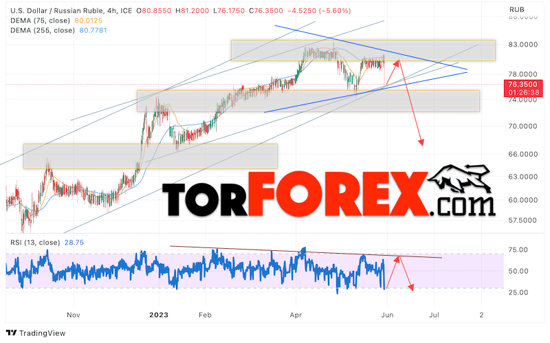 Дополнительным сигналом в пользу падения валютной пары USD/RUB 31 мая 2023 выступит тест линии тренда на индикаторе относительной силы. Вторым сигналом станет отскок от верхней границы модели «Треугольник». Отменой варианта падения пары USD/RUB на Форекс станет сильный рост котировок и пробой уровня 83.45 Рублей за Доллар. Это укажет на пробой области сопротивления и продолжение роста пары Доллар Рубль в область выше уровня 88.65. Подтверждением падению пары выступит пробой области поддержки и закрытие котировок актива под уровнем 74.00, что укажет на пробой нижней границы модели и начал отработки паттерна с целями внизу.