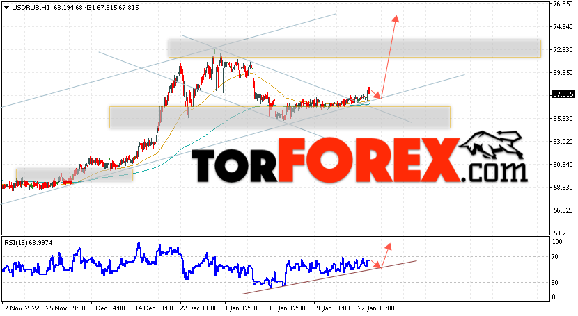 Дополнительным сигналом в пользу подъёма валютной пары USD/RUB 31 января 2023 выступит тест бычьей линии тренда на индикаторе относительной силы. Вторым сигналом станет отскок от нижней границы бычьего канала. Отменой варианта роста пары USD/RUB на Форекс станет падение котировок и пробой уровня 64.65 Рублей за Доллар. Это укажет на пробой области поддержки и продолжение падения пары Доллар Рубль в область ниже уровня 58.05. Подтверждением росту пары выступит пробой области сопротивления и закрытие котировок актива над уровнем 68.65.