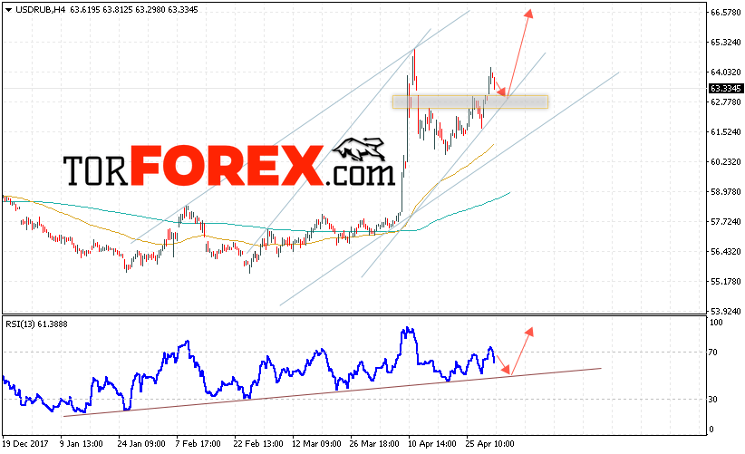 Таким образом, USD/RUB прогноз курса Доллара на 4 мая 2018 предполагает попытку теста уровня поддержки вблизи области 62.90, откуда стоит ожидать отскок и попытку продолжения роста курса Доллара против Рубля с целью выше уровня 67.00, дополнительным сигналом в пользу роста пары выступит тест линии тренда на индикаторе относительной силы.