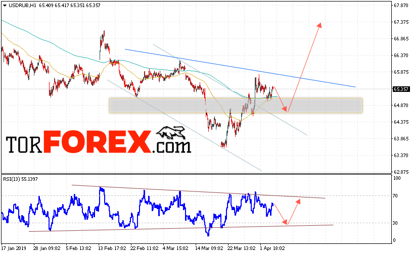 В пользу подъёма пары USD/RUB 5 апреля 2019 выступит тест линии поддержки на индикаторе относительной силы. Вторым сигналом станет формирование перевернутой модели «Голова и плечи». Отменой варианта подъёма пары USD/RUB на Форекс станет падение и пробой уровня 63.45 Рублей за Доллар. Это укажет на пробой области поддержки и продолжение снижения пары Доллар Рубль в область ниже уровня 62.55. Подтверждением роста пары выступит пробой области сопротивления и закрытие выше уровня 66.05.